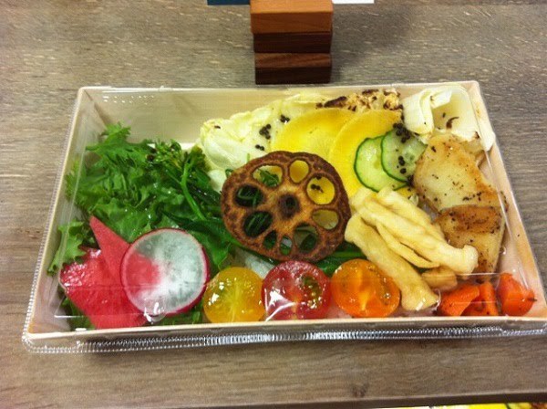 こちらのちらし寿司はなんと野菜オンリーのお寿司でした。甘めの寿司飯はと色とりどりのお野菜のバランスがとても良く、野菜によって処理や下味が異なっていて、大満足なランチBOXでした。野菜の種類を数えて見たらなんと15種類も入っていてびっくりしました。