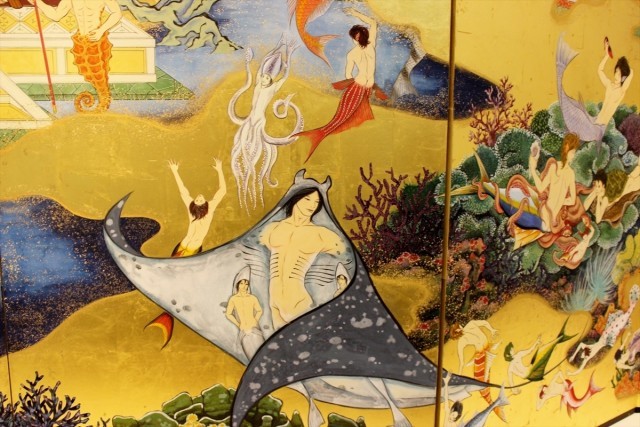 新作の「龍宮楽園」は、古くからある日本の伝統的な構図で、海底の楽園を描いている。一見、古文や日本史の教科書で見たような構図だが、そこに描かれているのは半裸の美しき人魚(マーマン)たち。