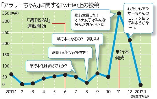 11月に単行本が発売さ れると、ツイートが急増。作中で描かれるモ テテクや女子の本音が勉強になったという声が多くみられた。(2011.01.01〜2012.01.06) /調査協力:サイバー・ コミュニケーションズ 拡大画像表示
