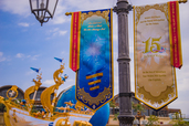 「ウィング・オブ・ウィッシュ号」のまわりには、クリスタルが埋め込まれたミッキーたちの15周年バナーで飾られています。