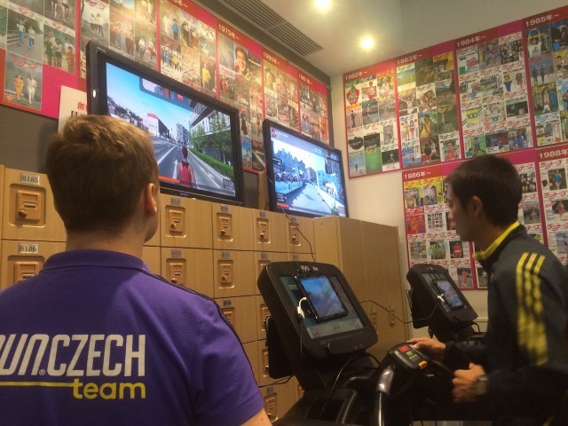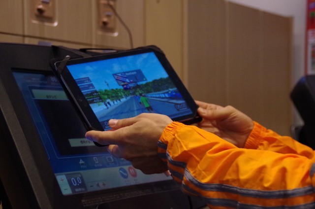 こちらは、いつも通りトレッドミルを走るだけ。トレッドミルが動き始めると、画面上のアバターが動き出しました。少しずつスピードを上げていくと、画面上の景色も移り変わりが早くなっていきます。