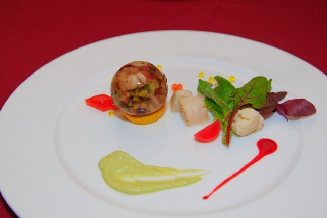 前菜は「オマール海老と野菜のアスピックと帆立貝のマリネ」になっています。