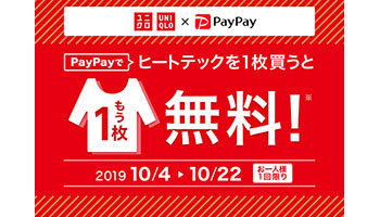 PayPayは、サービス開始から1周年を記念して10月4~22日の期間、ユニクロとコラボレーションしたキャンペーンを実施する。期間中、ユニクロ店頭で「PayPay」を利用してヒートテックインナーを購入すると、もう1枚が無料になる。