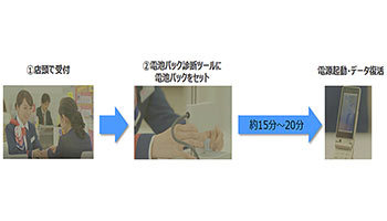 再び見られるようになった携帯電話に保存した写真などのデータは、SDカード、赤外線通信、店頭のデータ移行機器「DOCOPY」などを使用して、現在使用している携帯電話へ移行・コピーできる。なお、一部特殊形状端子の電池パックや内蔵電池タイプの機種については、電池パック診断ツール非対応のため、受付対象外。