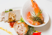 ※別途¥800で「豚ロースの香り揚げのせ御飯 タラバ蟹のXO醤添え」に変更いただけます。 - 杏仁パンナコッタとコーヒーゼリーのミルクソース