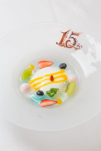見つめるだけで、口の中に広がる風味を思い出す純白の杏仁豆腐は、アニバーサーリーコースらしく、鮮やかに彩られています。