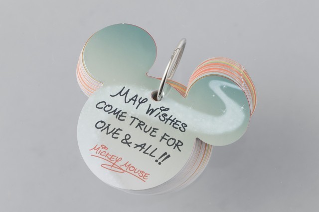 ミッキーたち7キャラクターの願い事がデザインされたミッキーシェイプのメモです。
