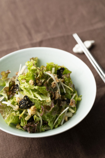- サニーレタスは手で一口大にちぎる。ネギは細切りにする。海苔はちぎる。クルミは割っておく。