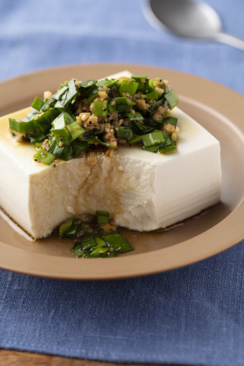 - ニラは小口切りにしてしょうがオリーブオイル、ポン酢とともに混ぜ、絹豆腐の上にかける。