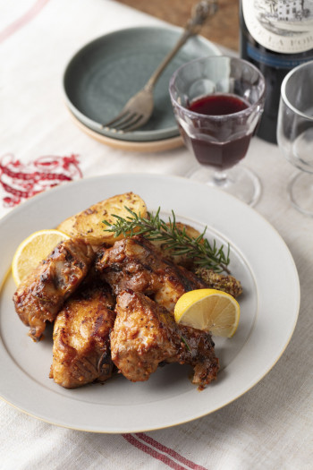 - フライパンにしょうがオリーブオイルを熱し、ジャガイモを並べ、焼き色がついたら返し、蓋をして蒸し焼きにする。火が通ったら取り出し、スペアリブを漬け込み汁ごと並べる。