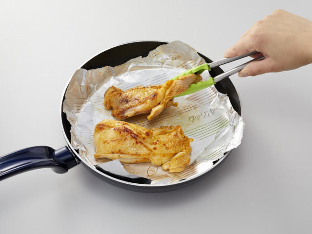 - フライパンに「クックパーフライパン用ホイル」を敷き、下味冷凍「鶏肉のスパイスヨーグルト漬け」のたれをぬぐい、皮を下にして並べる。中~弱火で片面5~6分ずつ焼く。