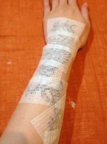 ヘナは衣類などに付着するとなかなか落ちないため、描いた後はカバーのために医療用テープを貼ります。