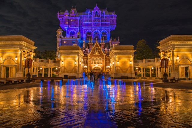 夜空に不気味にそびえ立つタワー・オブ・テラーを背景にして記念撮影もステキですね。