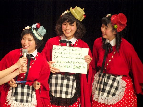 さて、ここで歌とダンスはいったんお休み。全グループが登場してのトークコーナーになります。まずは各グループが地元アピールや自分アピールをあいうえお作文で!というコーナーだったのですが、まず存在感を見せたのが青森のりんご娘でした。いや、だって、青森弁で話されると何を言ってるか全くわからないんデス!そのわからなさに笑いが起きる、という感じで会場も沸いていて、オイシイ武器もってんなーって感じでした。りんご娘さんももっと評価されていいグループの一つですよね。あと、我らが栃木のとちおとめ25は、あいうえお作文だって言ってるのに「と・ち・お・と・め」で作っちゃって、元気いっぱいなんだけど会場の反応ビミョー、みたいな、その感じが心地よいズレを生んでおりました。そういうフリーダムなの、大好物ですよ!お次はエア食レポといって各地の名物を食べてる風に演じる、みたいなのもあったんですが、静岡のミラクルがですね、小学生らしさを遺憾なく発揮!演技に夢中になっちゃってマイクに声が全然入ってない!逆転してすっげーリアル!みたいなのが爆笑でした。このトークコーナーは、挙手制で当てられるので、みんな「はい!はい!」ってアピールするんですが、フルーティーがもはや土下座一歩手前みたいなところまで行ってアピールしてたのも面白かったです。やっぱフルーティーいいですよ!こういうの大事だと思います!
