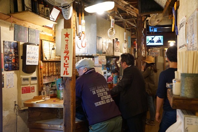 店内にはたゆたゆさん系列ではお約束の電車のつり革が…。焼きトンセンターさんではセルフスタイルで日本酒を頂く事ができます。