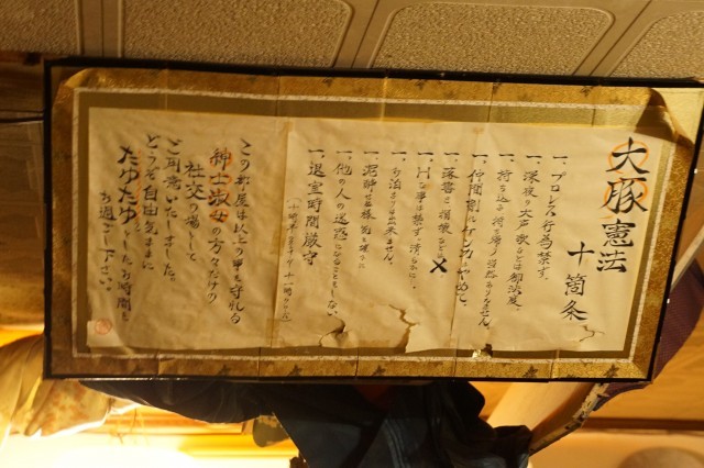壁には「大豚憲法十箇条」なるものが。飲み過ぎて、羽目を外し過ぎないようにこの十箇条をよく読んで楽しい宴会を!