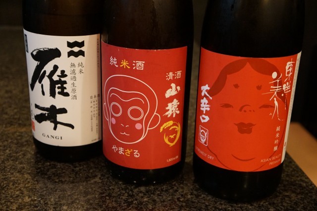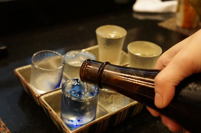 こちらでは是非食べてほしい逸品があります。まずはお酒で、利き酒セットを。