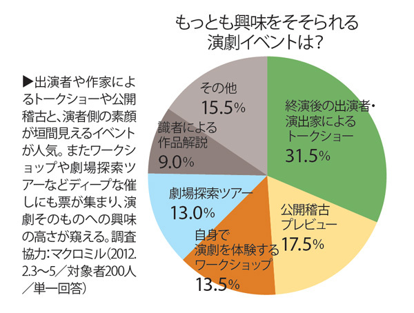 こうした状況を支える背景には、まず、観客が潜在的に多角的な好奇心を持っていた、という素地がある。小劇場から始まったこの流れは、いまや商業演劇でも採り入れられ、バックステージツアーなどの形で展開されているが、ほとんどの企画はチケット代のみで参加できることもあり、反響は非常に大きい。