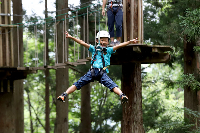 はじめはおっかなびっくりだったソウタくんも、徐々にコツをつかんでエンジョイ! 木々の間を滑走する「ジップスライド」はスリル満点で、大人も童心に返ってハシャいじゃうこと間違いなしです。