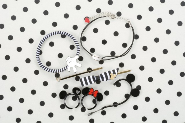 そんな流行コーディネートに自然に馴染む「Simple One」のモノトーンアクセサリーは、ミッキーの耳モチーフのリングやイヤーカフ、ハンドモチーフがついたボーダーのヘアポニーなど、クールさと可愛らしさが絶妙なバランス。