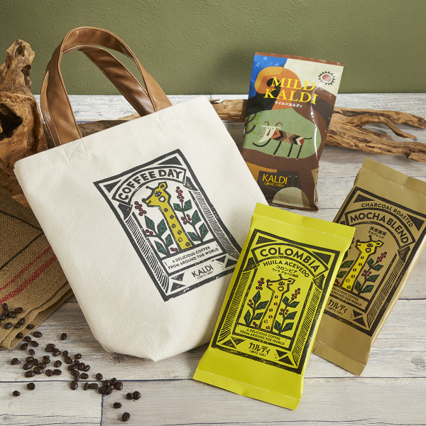 限定コーヒー「炭焼珈琲モカブレンド」と「コロンビア ウィラ アセベド地区」、カルディコーヒーファーム人気No.1コーヒー「マイルドカルディ」を、A4サイズがすっぽり入るトートバッグにセットした「コーヒーの日バッグ」は、自然あふれるコーヒーの産地をイメージした、キリンとコーヒーの木をモチーフにした版画調デザインとなっています。