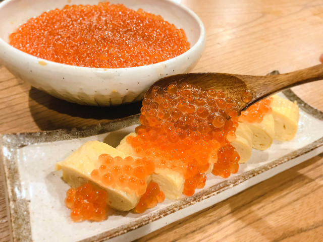 そのままでも美味しいのですが、ご飯の上に乗せたり、蟹を使った「本ずわい蟹のにぎり」や「北海道男爵の自家製ポテトサラダ」、「出汁巻き玉子」など、いくらを乗せた贅沢な味変やトッピングも楽しむのもオススメです。