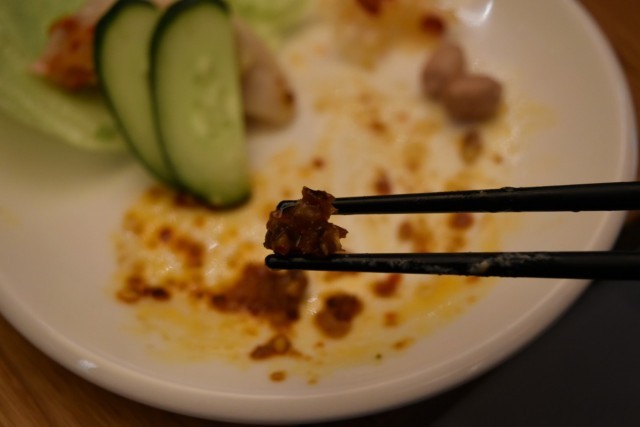 カリカリとした触感とエビの旨みがよく出たソースです。ワンタンの具は、ひき肉やきくらげが入っていて、プリッとしたお肉とコリコリしたきくらげの触感が楽しめます。