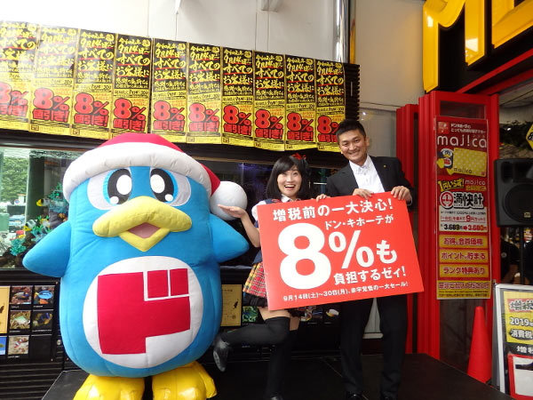 期間中に総額100億円の還元を目指す。それを超えても(セール終了まで)継続して実施――。10月1日に始まる消費増税直前の駆け込み需要を最後まで刈り取ることを狙って、過去最大級の赤字覚悟の一大セール「ドン・キホーテが8%も負担するゼィ!」を9月14日から増税前日の9月30日まで、全国のドン・キホーテ系列の384店舗で実施している。