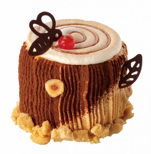 キャラメルクリームがフワッ。ヘーゼルナッツクリームがトロッ。プラリネフィアンティーヌがサクッ。様々な食感が楽しめる切り株ケーキです。