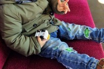 ほんの数分の乗車時間ですが、ずっーーーーーと食べています。子どもなので当然、周りに粉を飛ばしてしまうことも。