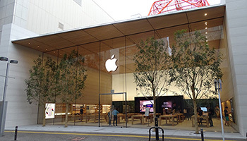 2018年の4月に東京・新宿にオープンしたApple 新宿から、アップルは最新の店舗デザインを国内の店舗に続々と導入してきた。大きなガラス窓の透明感とウッドの温もりを活かした建築デザインに共通の特徴を持たせながら、各店舗ごとにユニークなワンポイントも作り込んでいる。例えばApple 福岡の場合、店舗奥の壁面には世界で初めて「障子スクリーン」と名付けた明かり取りを設けた。昼間は自然光を取り込み、夜間は淡い照明が店の中を照らして独特の雰囲気を演出する。