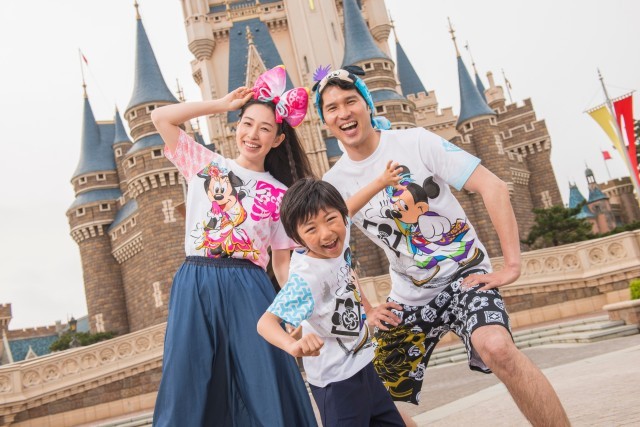 キッズサイズから3Lサイズまでそろい、おそろいで着られるTシャツはミッキーとミニーの2色展開。