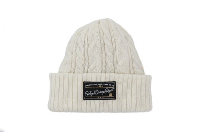 ミッキーのタグがある面とロゴが散りばめられた面があるニットキャップ。