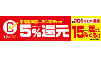公式サイトによると、家電量販店ではデンキチだけという。PayPay、QUICPay、iDなどのスマホ決済・電子マネー、クレジットカードなどに対応しており、利用した還元対象のキャッシュレス決済に応じた方法で5%還元される。なお、運営するオンラインショップは対象外。