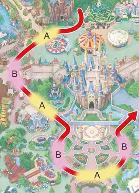 パレードは、ファンタジーランドをスタートし、ファンタジーランド、ウエスタンランドで3か所、プ ラザで 3か所の停止。