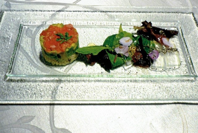 一品目は「彩り野菜とキヌア、スモークサーモンとアボカドのタブレ アロエのカルパッチョとマイクロリーフ チアシードの青じそドレッシング」。
