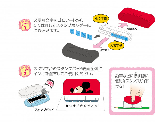 種類は「ミッキー」「プー」の2種類で、大文字・小文字ゴムシートに加え、名前と一緒にかわいらしいキャラクターのイラストが捺せる、キャラクターゴムシートが付属しています。