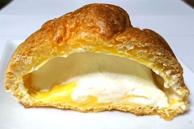 大きめのシューを割ってみると、パッケージの写真のとおり、下段がカスタードクリーム、上段がホイップクリームの2層になっており、ひと口で2つのクリームがしっかり楽しめる構造に。とろっとしたカスタードクリームと、ふわっと軽いホイップクリームが混ざり合う、至福の甘さがたまりません。