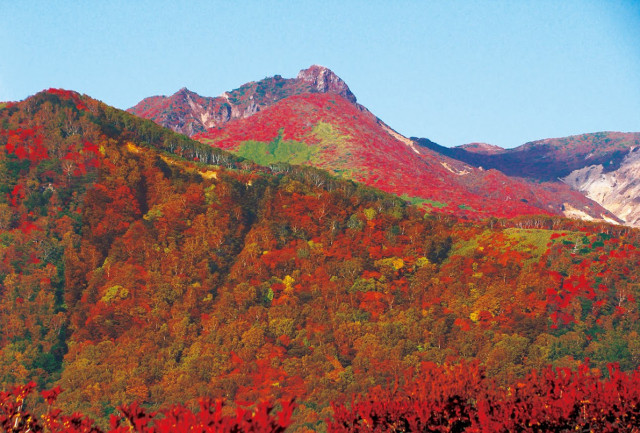 山頂に到着すると、眼前に広がるのは色鮮やかな紅葉に染まった那須連山! 澄んだ秋の青空とのコントラストは、誰もが心奪われる光景です。ぜひ立ち寄りたいのが、山頂にある2つの展望台。異なる高台から眺める紅葉は、違った表情を見せてくれます。