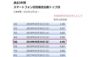 直近3年間のスマートフォンの日別販売台数の上位には2019年が並ぶ。1位は今年3月31日で、9月29日も5位に食い込んだ