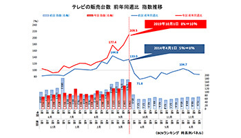 【BCN速報値】全国の主要家電量販店・ネットショップのPOSデータを集計した「BCNランキング」の速報値によると、10月1日の増税直前の最終週となる9月4週(9月23日~9月29日)のテレビの販売台数は前年同週比で209.5%を記録した。前回増税時の2014年4月1日直前の3月4週の同133.0%より76.5ポイントの差が開き、前回より増税前の駆け込み需要が大きかったことを示した。