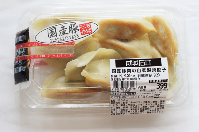 「国産豚肉の自家製焼き餃子」499円(税抜)は、ずらりと店内の一角に平積みされた人気商品。餃子1パックと一緒に、餃子のたれとラー油もセットになっています。一人暮らしの場合は、ラー油など調味料を持っていなくても、餃子に一回の使い切りがついています。量も一回分なので、気がねなく使うことができます。