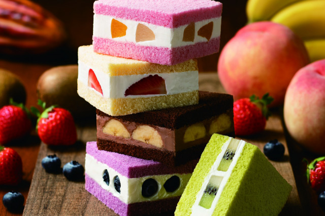 「カラフルフルーツサンド」は、カラフルな見た目がかわいい、ワンハンドで気軽においしく食べられるフルーツサンドケーキ。苺、チョコバナナ、ブルーベリー、キウイフルーツ、ピーチの5種類が登場しています。