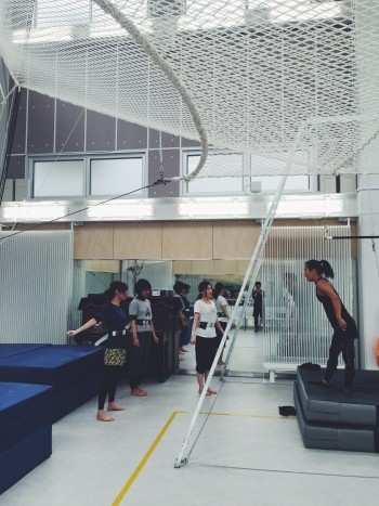 ここは、2015年8月に名古屋にできた屋内型の空中ブランコ施設「フラインフィット トラピーズスタジオ」。白をベースとした施設は清潔感があり、かつ、大きな空中ブランコセットに少し圧倒されます。
