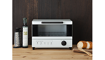 ORIGINAL BASIC オーブントースターは、幅31cmで場所を選ばない。900Wで、6枚切りの食パン2枚が2~3分で焼ける。ドアを開けると、焼き網が手前に出て取り出しやすいほか、スライド式パンくずトレーで簡単に手入れができる。