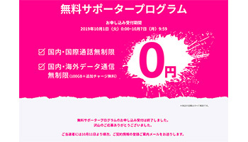 無料サポータープログラムは、品質テスト、アンケートに協力することを条件に、無料で国内・海外データ通信を無制限に、国内・国際通話を無制限に利用できるサービス。東京23区、名古屋市、大阪市、神戸市に住んでいる18歳以上を対象に参加者を募っていた。