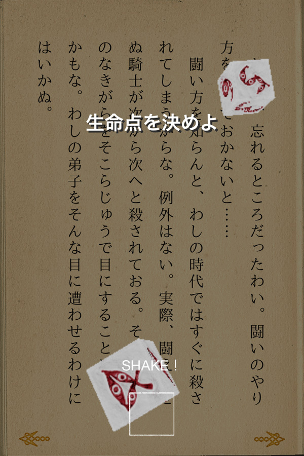最初にiPhoneをシェイクしてサイコロを振り、自分の生命点(ライフ)の最大値を決定します。重要な場面ではサイコロを振って結果を決めるのがゲームブックの特徴です。