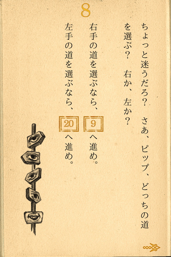 読み進めていくと、このように選択肢が出ることがあります。ここがゲームブックの醍醐味。自分の行動を決めたら、数字部分をタップします。するとそこからストーリーが分岐していくのです。