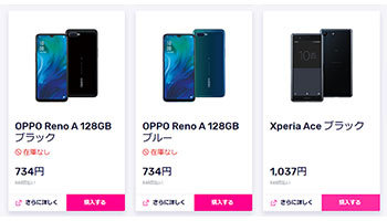 今回のプログラムの新規購入で対象になる端末は、AQUOS sense3 lite、Xperia Ace、Galaxy A7、OPPO Reno A 128GB、arrows RX、HUAWEI P30 liteの6機種。記者は15日の案内メールがきてすぐに手続きを開始したが、OPPO Reno A 128GBのブルーはすでに「品切れ」と表記されていた。仕方なくブラックを購入したが、翌日に「製品購入ページ」をのぞくとブラックも品切れになっていた。