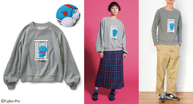 どこでもドアから出かけるドラえもん。その後ろ姿を、もこもこのパイル刺しゅうで表現したというトップス。立体感のある凝ったつくりで、大人に似合うアートな仕上がりとなっています。
